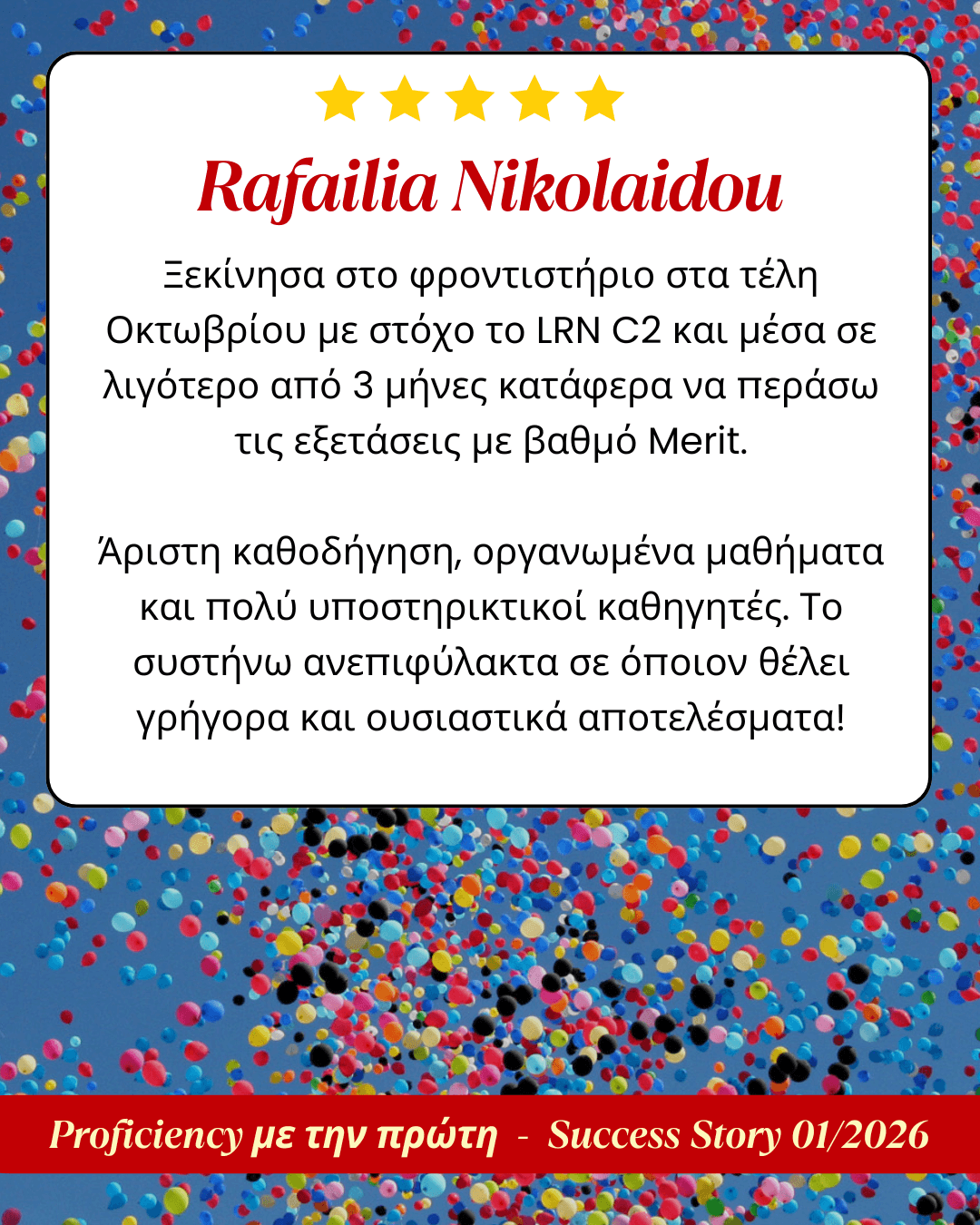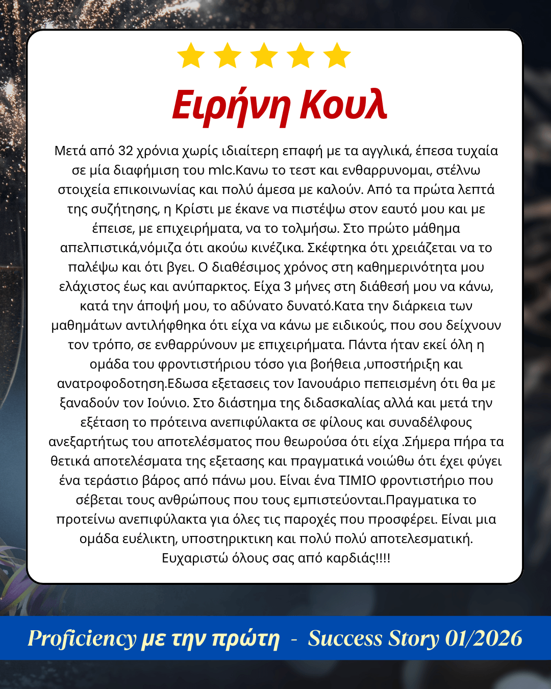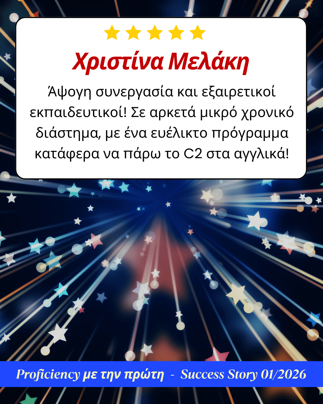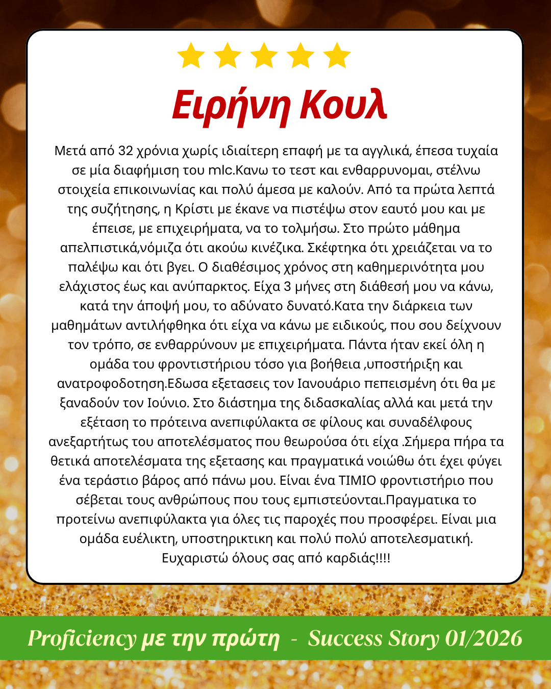 Δείτε τους σπουδαστές μας και την δική τους επιτυχία με την πρώτη Από το 2013 με 97% επιτυχία Εκδήλωση ενδιαφέροντος Τι ώρες θέλετε να σας καλέσουμε; 9-1 το πρωί5-9 το απόγεύμαΣάββατο 9-3 Τι μαθήματα σας ενδιαφέρουν; προετοιμασία Proficiencyπροετοιμασία Lowerγια επικοινωνία (ομιλία)Βusiness English Please leave this field empty.