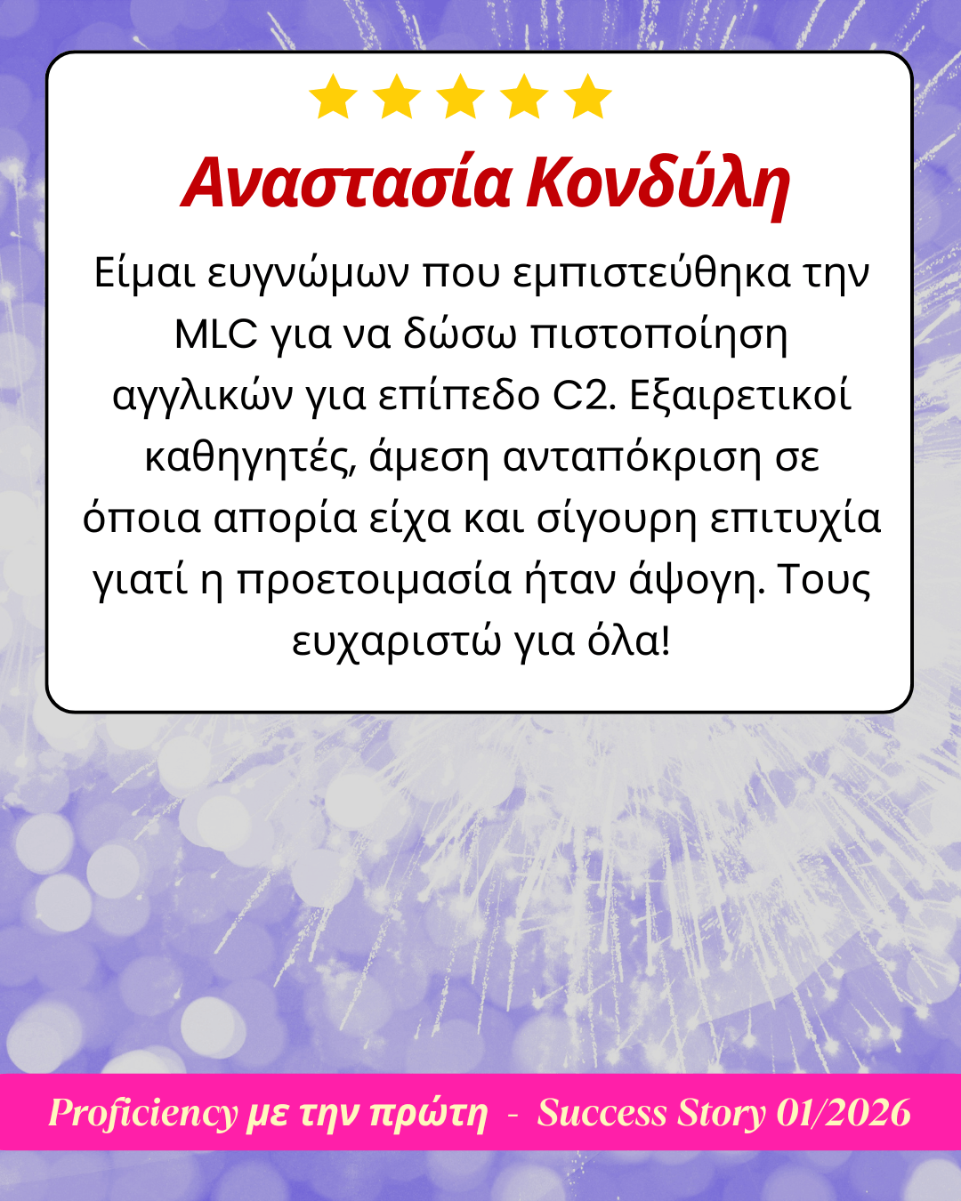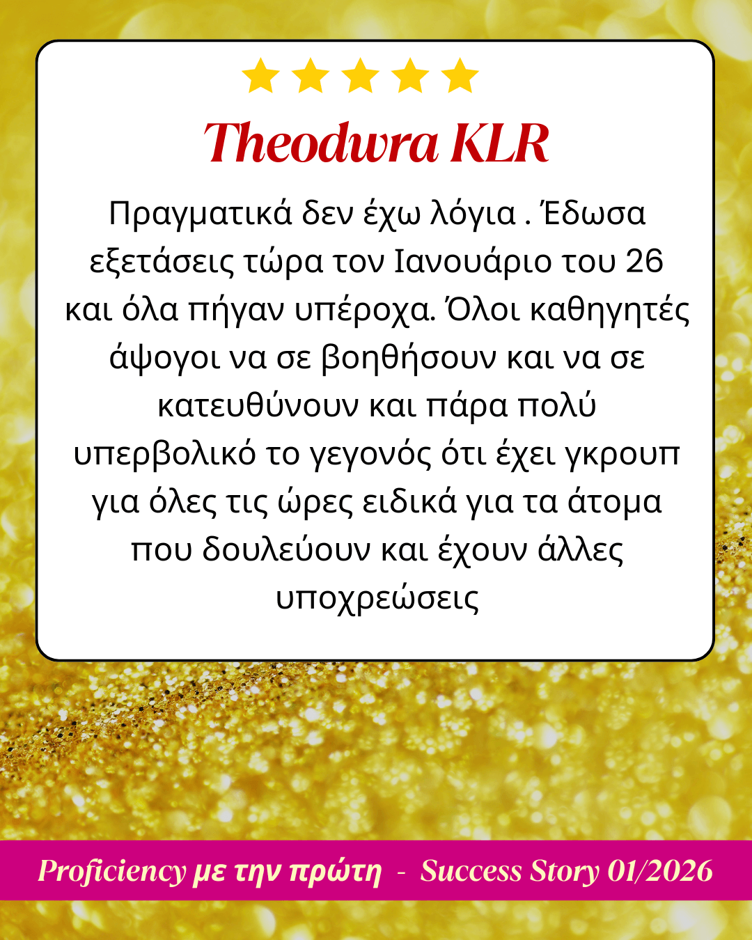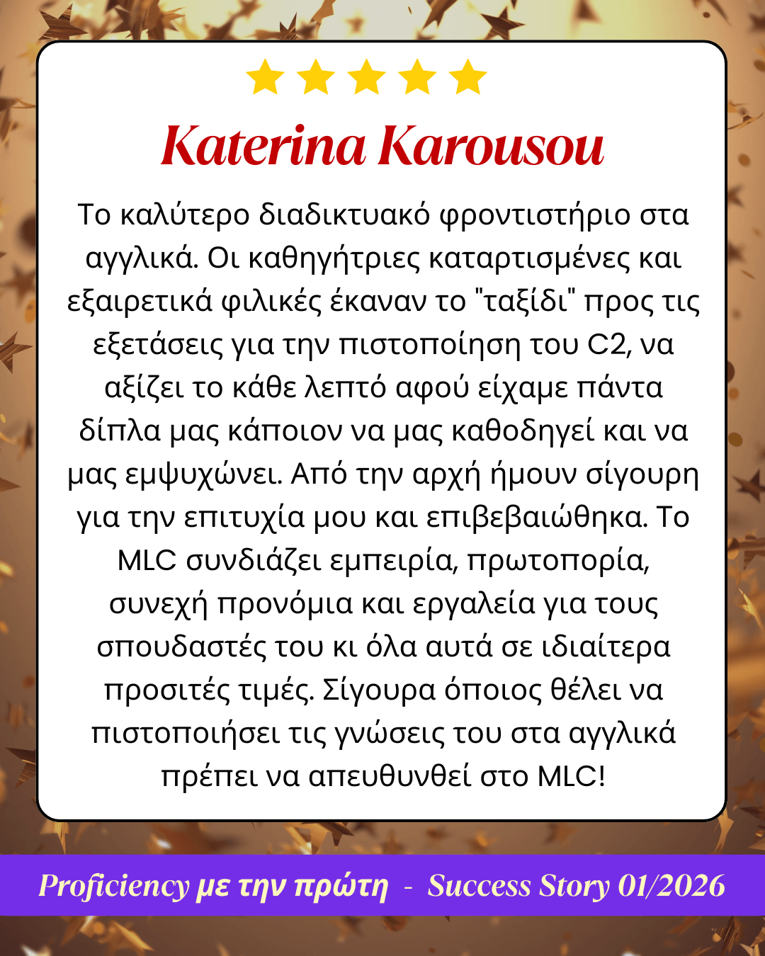 Δείτε τους σπουδαστές μας και την δική τους επιτυχία με την πρώτη Από το 2013 με 97% επιτυχία Εκδήλωση ενδιαφέροντος Τι ώρες θέλετε να σας καλέσουμε; 9-1 το πρωί5-9 το απόγεύμαΣάββατο 9-3 Τι μαθήματα σας ενδιαφέρουν; προετοιμασία Proficiencyπροετοιμασία Lowerγια επικοινωνία (ομιλία)Βusiness English Please leave this field empty.