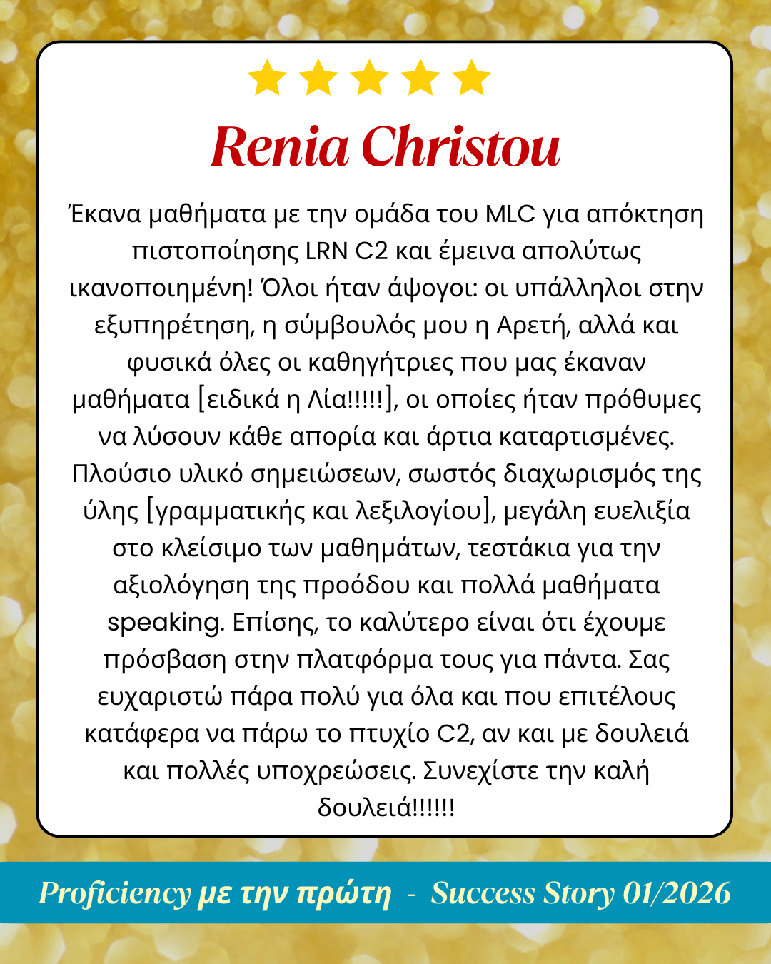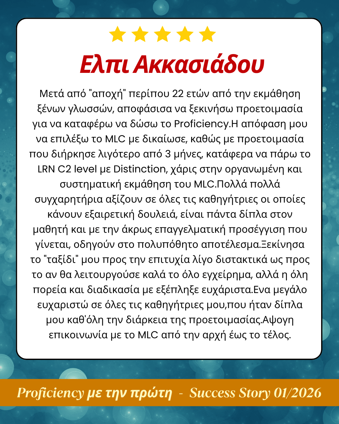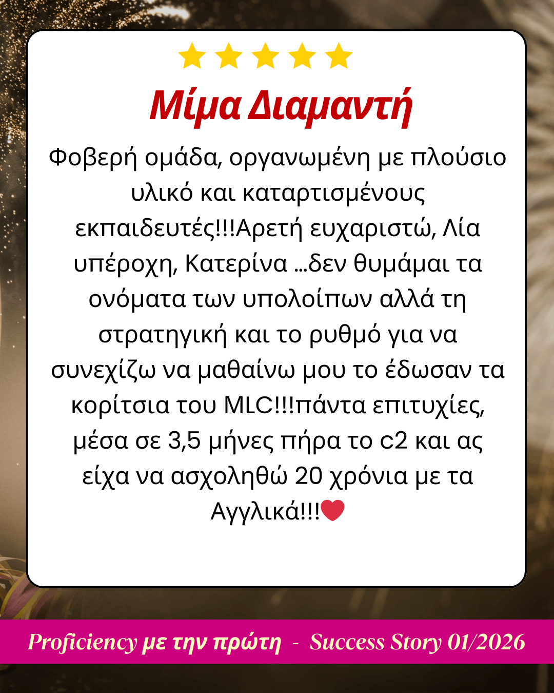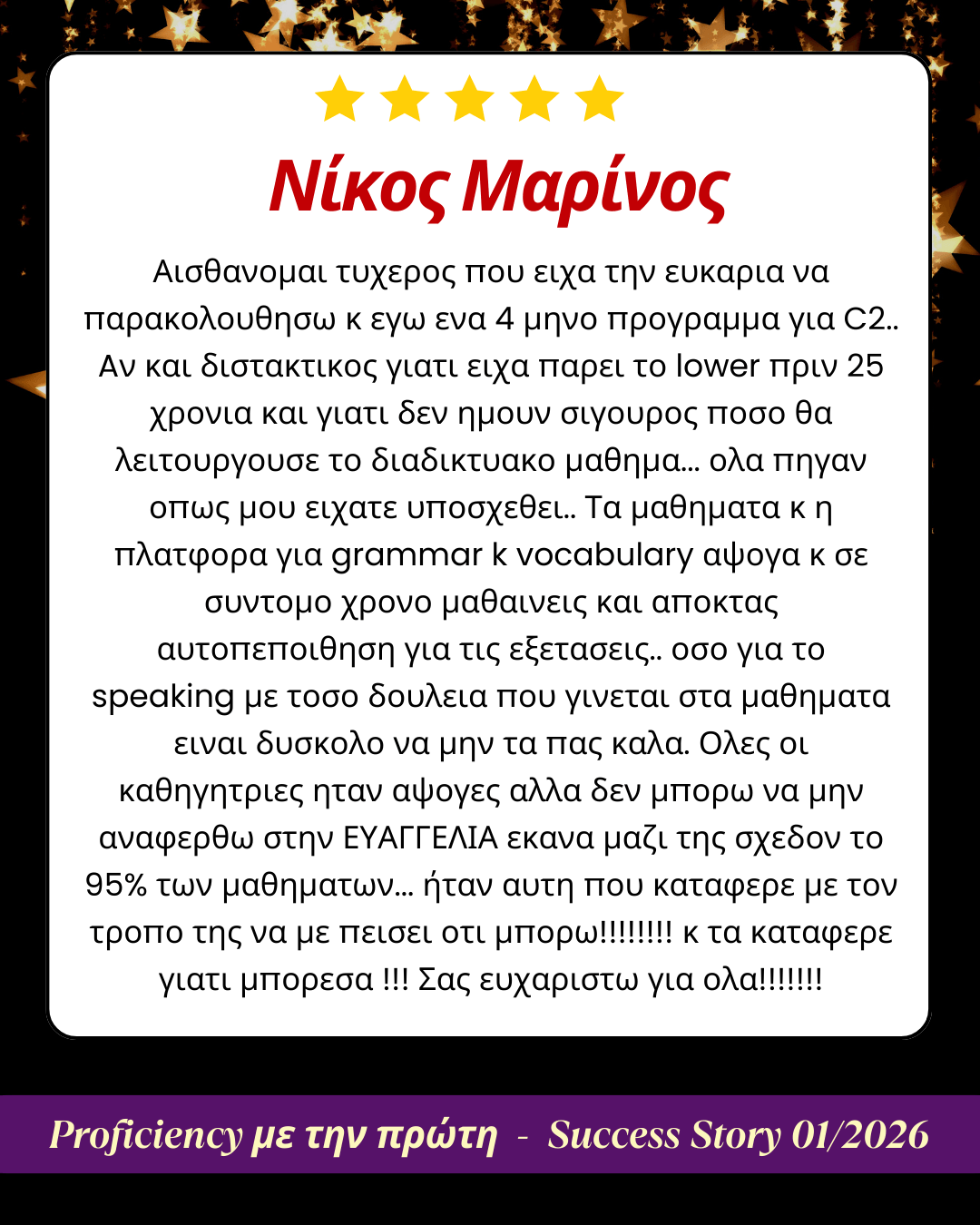 Δείτε τους σπουδαστές μας και την δική τους επιτυχία με την πρώτη Από το 2013 με 97% επιτυχία Εκδήλωση ενδιαφέροντος Τι ώρες θέλετε να σας καλέσουμε; 9-1 το πρωί5-9 το απόγεύμαΣάββατο 9-3 Τι μαθήματα σας ενδιαφέρουν; προετοιμασία Proficiencyπροετοιμασία Lowerγια επικοινωνία (ομιλία)Βusiness English Please leave this field empty.